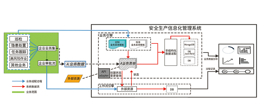 系统规划包括定制化表单引擎、工作流引擎、消息队列和数据持久化模块、BI商业智能对接模块组成,其中表单引擎和工作流引擎承担了主要业务功能。包含功能模块和支持业务包括:人员管理、培训和资质管理、巡检管理、隐患处理、任务跟踪、高风险作业管理、物资管理、应急管理、预警管理。