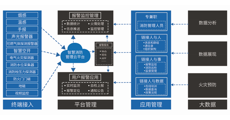 安消一体化平台由消防主机透传模块、火灾自动报警主机、智慧用电、消防水智能传感终端(包括消防管道压力与消防蓄水池液位检测)、智能烟感、视频监控、Web应用端、手机移动端组成。应用物联网技术实现智能报警终端与Web端平台连接,实时掌握消防主机终端点位、用电线路与消防水系统情况,发现隐患及时处理。并能通过视频联动第一时间查看现场情况,把火灾隐患降到最低。