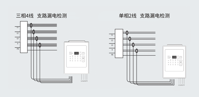 (8)产品用于在线监测AC380V\220V配电线路的漏电电流,探测器安装在低压配电箱中,监测4条线路的绝缘状态。