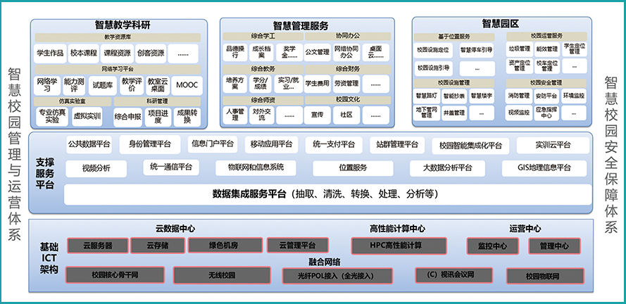 智慧校园是以促进信息技术与教育教学融合、园区管理、提高学与教的效果为目的,以物联网、云计 算、大数据分析等新技术为核心技术,为学校提供一种环境全面感知、智慧型、数据化、网络化、协作型 一体化的教学、科研、管理和生活服务为一体的综合性解决方案。